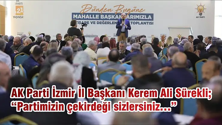 Ak Parti İzmir İl Başkanlığı’nın düzenlediği “Dünden Bugüne Mahalle Başkanlarımızla İstişare ve Değerlendirme” toplantısında, rekor katılımla Mahalle Başkanları ile bir araya gelindi. İzmir’in 14 ilçesinden mahallelerinde görev yapmış ve yapmakta olan Mahalle Başkanlarını ağırlayan İl Başkanı Kerem Ali Sürekli; bu gücün, 21 yıldır aralıksız süren iktidarlarının hizmet ve başarılarının lokomotif gücü olduğunu belirterek; “Sizler, partimizin temel taşısınız. AK Parti Ailesi; dünden bugüne milletle bir bütün halinde yoluna devam ediyorsa, sizlerin de sayesindedir. Heyecanımız ilk günkü gibi biliyorum. Çünkü tazelenmeyi, yenilenmeyi biliyoruz. 2023 hedefimize de bu birlik beraberlik sayesinde; mahalle başkanlarımız, üyelerimiz ve bize gönül verenlerle birlikte varacağız.” diye konuştu.