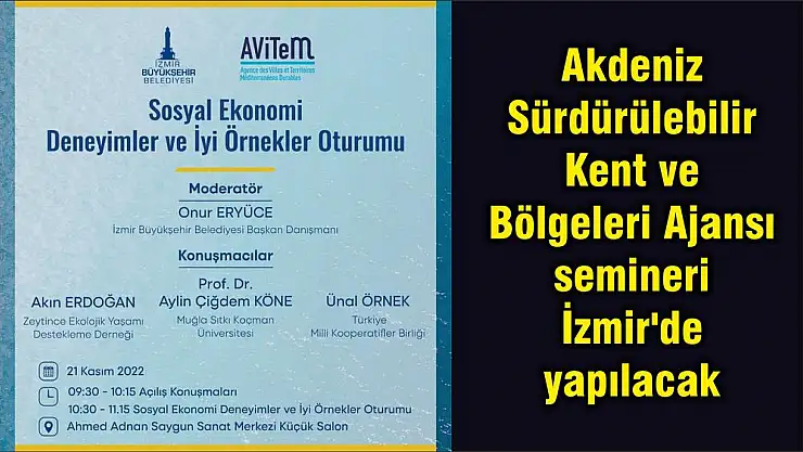 Akdeniz’de kentsel ve bölgesel iş birliği çalışmaları yürüten, üyeleri arasında Fransız Dış İşleri ve Avrupa Bakanlığı, Marsilya Belediyesi ve Euroméditerranée Kamu Kalkınma Ajansı gibi kurum ve kuruluşların bulunduğu Akdeniz Sürdürülebilir Kent ve Bölgeleri Ajansı (AVITEM), İzmir Büyükşehir Belediyesi ev sahipliğinde İzmir’de 21-25 Kasım 2022 tarihlerinde uluslararası bir seminer düzenleyecek. Fransız Kalkınma Ajansı (AFD) ve Akdeniz Entegrasyon Merkezi (CMI) gibi kuruluşlarla işbirliği içerisinde düzenlenecek seminere kent yönetimi uzmanları, bürokratlar, diplomatlar, akademisyenler ve sivil toplum yetkililerinden oluşan yaklaşık 25 kişilik uluslararası bir heyetin katılması bekleniyor.