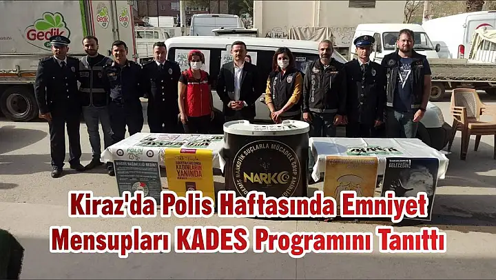 10 Nisan Polis Haftası etkinlikleri kapsamında Kiraz İlçe Emniyet Müdürlüğüne bağlı Polis ekipleri KADES programının tanıtımını, Kiraz Veterinerlik Fakültesi yanındaki sokakta yaptı.Polis Ekipleri Stant açarak Kirazlı kadınları broşürle KADES programının nasıl kullanılması gerektiği konusunda bilgilendirdi.
