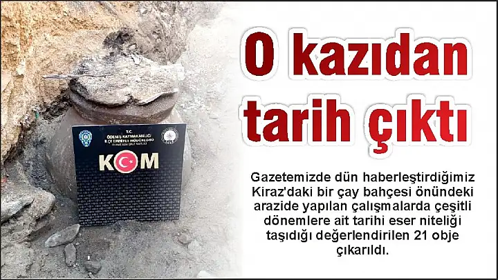 Gazetemizde dün haberleştirdiğimiz Kiraz'daki bir çay bahçesi önündeki arazide yapılan çalışmalarda çeşitli dönemlere ait tarihi eser...