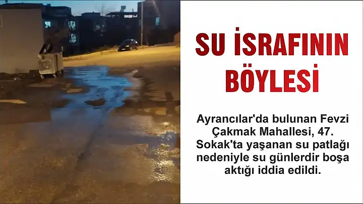 Ayrancılar'da bulunan Fevzi Çakmak Mahallesi, 47. Sokak'ta yaşanan su patlağı nedeniyle su günlerdir boşa aktığı iddia edildi. Civar sakinleri defalarca İZSU'yu arayarak ihbarda bulunduğunu ifade etmelerine rağmen kimsenin gelmediğini ifade ettiler. Vatandaşlar, yaz aylarında çekilen su sıkıntısının yanı sıra bu gibi aksaklıklardan kaynaklanan kaçak kayıp bedellerinin de faturalarına yansıtıldığının altını çizerek bu israfın faturasını ödemek istemediklerini söylediler. Öte yandan vatandaşlar telefonla yapılan ihbarlarına sonuç alamadıklarını bu nedenle son çare olarak seslerini sosyal medya üzerinden duyurmaya çalıştıklarını ifade ettiler. Sosyal medyadan yapılan ihbarlara ise otomatik olarak sorunun ilgili birime aktarıldığı cevabı verilse de sorunun hala çözülmediği öğrenildi.