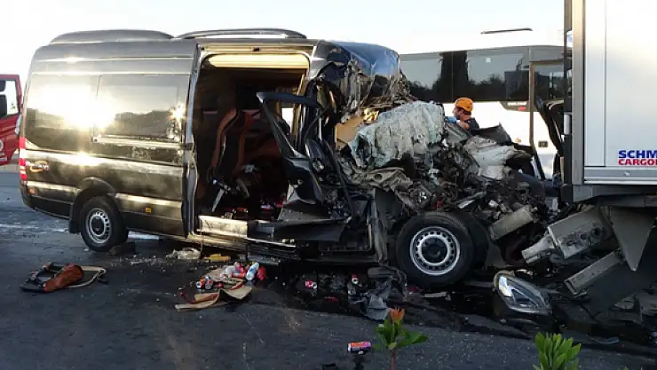 Antalya’nın Alanya ilçesinde turist minibüsü, tır ile çarpıştı. Kazada 2 kişi hayatını kaybetti, 6’sı ağır 10 kişi de yaralandı.