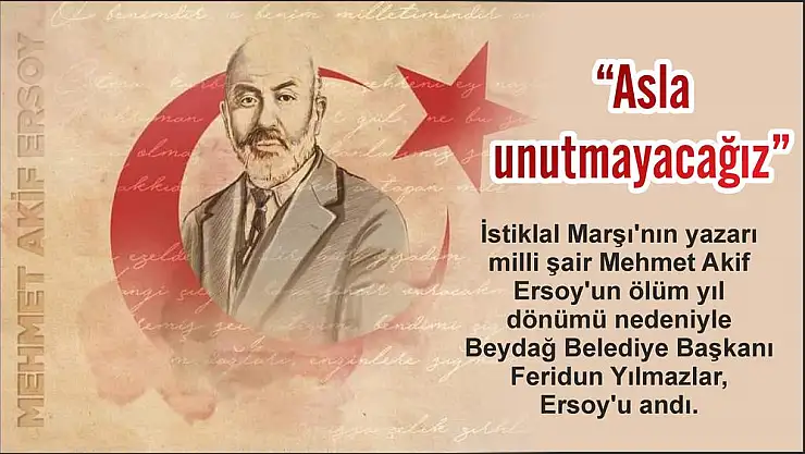 İstiklal Marşı’nın yazarı milli şair Mehmet Akif Ersoy’un ölüm yıl dönümü nedeniyle Beydağ Belediye Başkanı Feridun Yılmazlar, Ersoy’u andı. Beydağ Belediye Başkanı Feridun Yılmazlar, “Milletin derdini dert edinen, davasına bütün benliğiyle inanan, bağımsızlık mücadelemizi mısralarıyla ölümsüzleştiren, İstiklal Marşımızın yazarı, büyük şair Mehmet Akif Ersoy’u vefatının 85. yıl dönümünde saygı ve rahmetle anıyorum. Milli şairimiz Ersoy’u hiçbir zaman asla ve asla unutmayacağız” dedi.