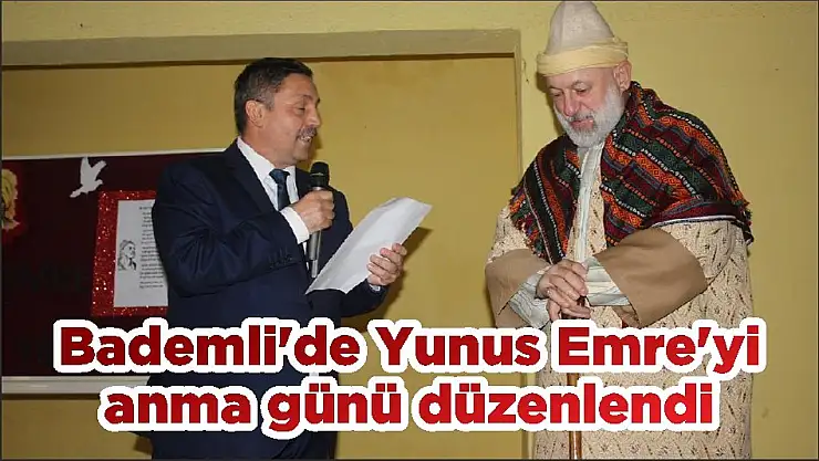 Ödemiş’e bağlı Bademli Mahallesi’nde Belediye Düğün Salonu’nda Yunus Emre’yi Anma Günü etkinliği gerçekleşti. Bademli Ortaokulu tarafından hazırlanan programda Anadolu’da Türkçe şiirin öncüsü olan ünlü tasavvuf ve halk şairi Yunus Emre için düzenlenen etkinlikte bir dakikalık saygı duruşu ve İstiklal Marşı’nın okunmasının ardından günün anlam ve önemini anlatan konuşmayı Bademli Ortaokulu Müdürü Ramazan Göçen gerçekleştirdi.