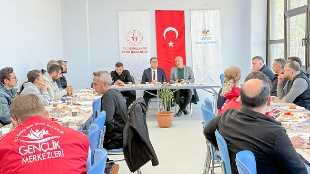 Bayındır İlçe Milli Eğitim Müdürü Serdar Ökay, Gençlik ve Spor Müdürü Erdal İnce ile birlikte Gençlik Merkezi Salonu'nda Okul Sporları konulu toplantıya katıldı
