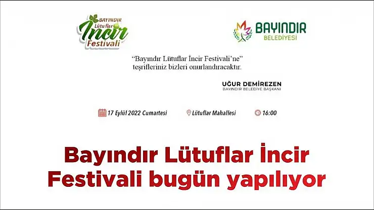 Bu sene ilk kez düzenlenen Bayındır Lütuflar İncir Festivali bugün Bayındır’ın Lütuflar Mahallesi’nde gerçekleşecek. Festival açılış töreni saat 16.00’da yapılacak ve saat 18.00’de Türk Halk Müziği sanatçısı Turgay Başyayla ücretsiz bir konserle sevenleriyle buluşacak. Festivalde ayrıca halk oyunu gösterileri, en iyi incir ve incir güzel yarışmaları da olacak.