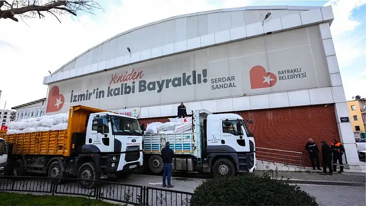Depremden etkilenen 10 ilde yürütülen çalışmalara Türkiye’nin her yerinden destekler çığ gibi büyürken Bayraklı’da da yardım seferberliği sürüyor. Depremin olduğu ilk günden itibaren ilçe genelindeki gönüllülerin de destekleriyle gece gündüz yardım toplayan ekipler, yüzbinlerce temel ihtiyaç malzemesini deprem bölgelerine ulaştırdı. 10’un üzerinde tır, toplanan yardımları karayoluyla afet bölgesine taşırken, İzmir Büyükşehir Belediyesi ile işbirliği halinde deniz ve hava ulaşımıyla da on binlerce yardım malzemesi bölgeye gönderildi. Başta çadır, konteyner ve uyku tulumu olmak üzere, ısıtıcı, battaniye, bebek bezi, mama, su, hijyen malzemeleri ve gıda ürünlerinin toplanarak depremzedelere ulaştırılmaya devam edileceği belirtildi.