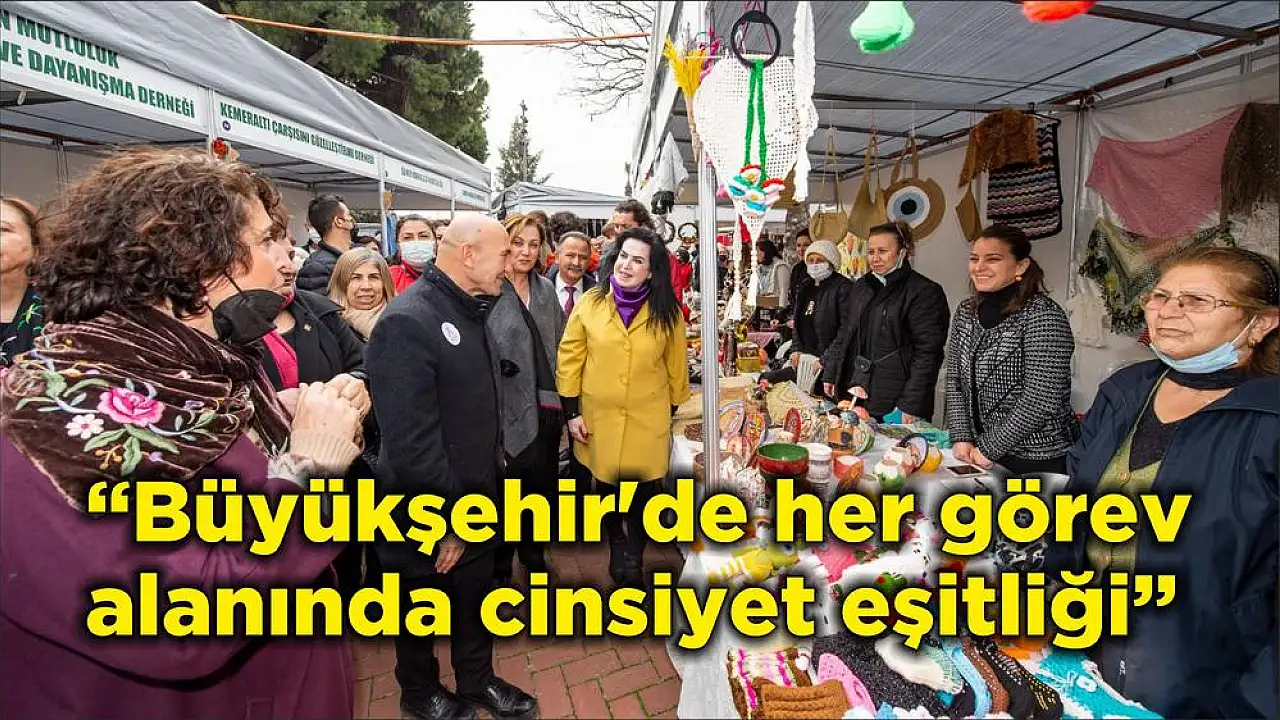 İzmir Büyükşehir Belediye Başkanı Tunç Soyer, 8 Mart Dünya Kadınlar Günü etkinlikleri kapsamında açılan Kadın Emeği Sergi ve Satış Pazarı’nda emekçi kadınlarla bir araya geldi. Başkan Soyer, İzmir Büyükşehir Belediyesi’nin evine ekmek götürmek isteyen her kadının yardımcısı olduğunu belirterek “Belediyemizdeki her görev alanında da cinsiyet eşitliğini sağlamak için emin adımlarla yürüyoruz. Gururla belirtmeliyim ki, ülkemizde en fazla kadın yöneticinin olduğu kurumların başında belediyemiz geliyor” dedi.