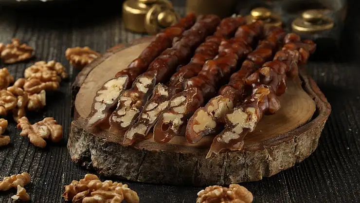 4. Pişen karışımımıza iplere dizdiğimiz cevizlerimizin her yerini batıralım.