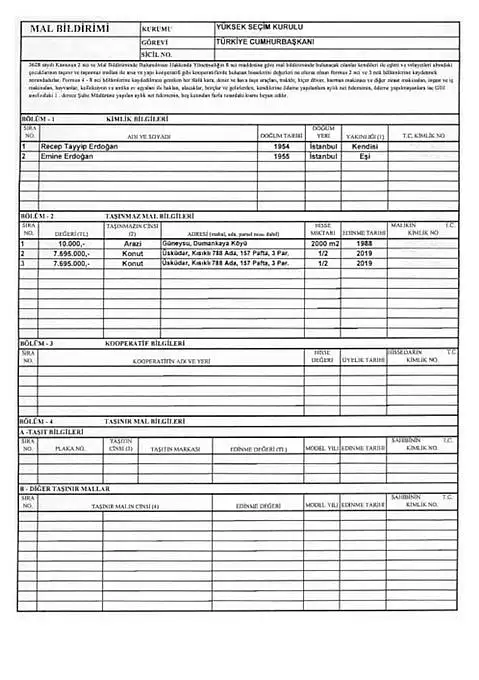 Listeye göre, Erdoğan’ın sahip olduğu taşınmazların listesi: Güneysu-Dumankaya Köyü 2 bin metrekare arsa (Maliyeti 10 bin TL) Edinme tarihi: 1988 Üsküdar-Kısıklı’da bir konutun yarı hissesi – (Değeri 7 milyon 695 bin TL) Edinme tarihi: 2019 Üsküdar-Kısıklı’da bir konutun yarı hissesi – (Değeri 7 milyon 695 bin TL) Edinme tarihi: 2019 Banka ve menkul değerlere ait bilgiler: Albaraka Türk Merkez Şubesi’nde 1 milyon 346 bin 614 lira 53 kuruş, Albaraka Türk Altunizade şubesi hesabında 96 bin 723 lira 55 kuruş, Ziraat Katılım Bankası 411 bin 541 135 lira, Nezninde 30 bin TL Borç – alacak bilgileri: Alacaklının adı ve soyadı: Mustafa Erdoğan, Tutar: 5 milyon 390 bin lira.