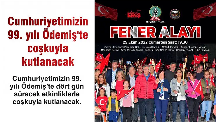 Cumhuriyetimizin 99. yılı Ödemiş’te dört gün sürecek etkinliklerle coşkuyla kutlanacak. Ödemiş Belediyesi’nin düzenleyeceği etkinliklerle kent merkezinin yanı sıra Kaymakçı, Konaklı ve Ovakent’te fener alayları ve konserlerle 99. yıl coşkusu yaşanacak. 28 Ekim’de Kaymakçı’da Tolga Çandar türkü şöleni yaşatırken 29 Ekim akşamı fener alayının ardından Ulus Meydanı’nda sahne sevilen sanatçı Gökçe’nin olacak.