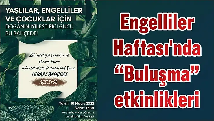 İzmir Büyükşehir Belediye Başkanı Tunç Soyer’in Engelsiz İzmir hedefini “Başka Bir Engelli Politikası Mümkün” anlayışıyla güçlendiren vizyonu doğrultusunda 10-16 Mayıs Engelliler Haftası kapsamında “Buluşma” temalı etkinlikler planlandı. Program, bugün İzmir Büyükşehir Belediye Başkanı Tunç Soyer’in yaşlılar, engelliler ve çocuklar için doğanın ve bitkilerin sakinleştirici etkisinin bir iyileşme aracı olarak kullanıldığı Terapi Bahçesi’nin açılışıyla başlayacak. İnciraltı Terapi Bahçesi’nde saat 17.00’de başlayacak Engelsiz Bahar Şenliği kapsamında aromatik bitkiler atölyesi, yalınayak parkuru, terapötik bahçecilik alanları, ahşap atölyesi, felsefe ve masal etkinlik alanı, doğa ile etkileşim kurulan biyofili çocuk oyun alanları, yürüyüş yolları ve oturma alanlarında çeşitli atölyeler ile kapsayıcı etkinlikler yapılacak. Terapi Bahçesi’nin açılışı ise Başkan Tunç Soyer’in katılımıyla 18.00’de olacak.