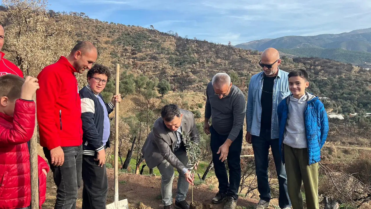 Öğrencilerin çevre bilinci kazanmasını sağlamak, aynı zamanda orman yangınlarında ekonomik değeri yüksek zeytin ağaçlarını kaybeden vatandaşlara destek olmak amacıyla gerçekleştirilen etkinlikte zeytin fidanları toprakla buluştu.