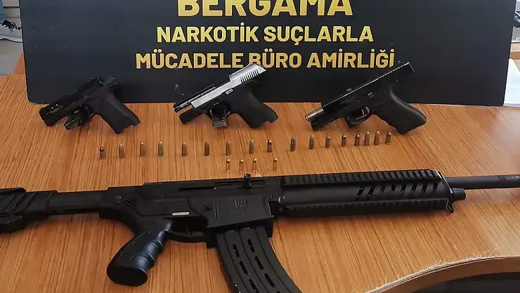 Bergama İlçe Emniyet Müdürlüğü görevlileri ve Bergama Narkotik Suçlarla Mücadele Büro Amirliği ekipleri, hakkında toplam 10 ayrı yakalama emri bulunan ve bu suçlardan 7 yıl 8 ay hapis cezası bulunan şüpheli T.B.’nin adresini belirledi. Gerçekleştirilen operasyonda şüpheli kıskıvrak yakalanırken, adreste yapılan aramada; 3 adet ruhsatsız tabanca, 1 ruhsatsız otomatik av tüfeği, 4 uyuşturucu hap ve değişik çaplarda 21 adet mermi ele geçirildi.