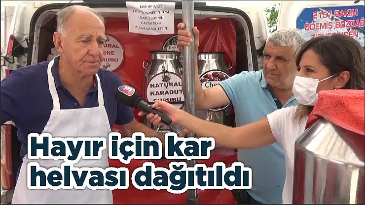 Ödemiş’te yaşayan emekli nikah memuru Ziya Dönmez, dokuz yıl önce vefat eden babası için Eski İstasyon mevkiinde kar helvası hayrında bulundu. Ziya Dönmez, “Babamın dokuzuncu ölüm yıl dönümü dolayısıyla 40 yıllık dostumuz sayın Adnan ağabeyim ile birlikte sıcak havalarda kar helvasıyla serinletelim dedik” ifadelerini kullandı.