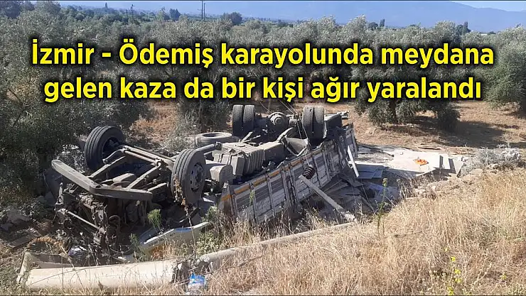 İzmir- Ödemiş karayolu Doyranlı mevkiinde kamyon şarampole devrilerek ters döndü. Kazada kamyon şoförü ağır yaralandı.