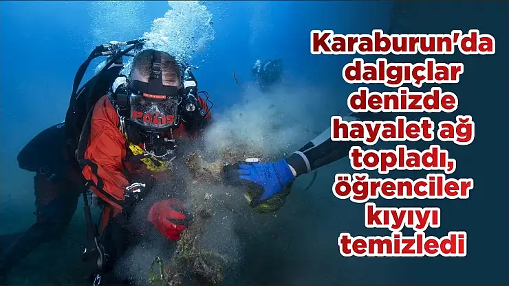Karaburun ilçesinde dalgıçlar denizde hayalet ağ topladı, öğrenciler ise kıyıda temizlik yaptı.