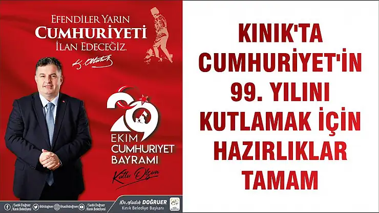Kınık Belediye Başkanı Dr. Sadık Doğruer, kutlamaların Cumhuriyet’e yakışır şekilde olacağını belirterek “Cumhuriyet’imizin 99. yılında, ilçemizde coşku dolu bir bayram geçirmek için Kınık Belediyesi olarak tüm hazırlıklarımızı tamamladık” dedi.