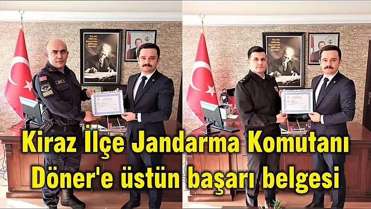 Kiraz İlçe Jandarma Bölük Komutanı Yusuf Murat Döner ile Kiraz İlçe Jandarma Bölük Komutanlığı’nda görev yapan Jandarma Uzman Kıdemli Çavuş Ali Şinay’a Kiraz İlçe Kaymakamlık hizmet binasında Kiraz İlçe Kaymakamı Onur Titiz tarafından, görevlerindeki başarılı çalışmalarından dolayı üstün başarı belgesi verildi.