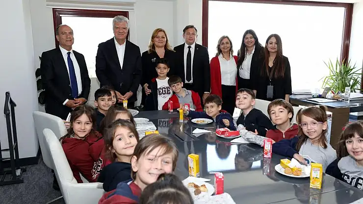 Ege Üniversitesi Güçlendirme Vakfı Okulları Narlıdere Kampüsü'nde okuyan çocuklar, Narlıdere Belediye Başkanı Ali Engin’i belediye binasında...
