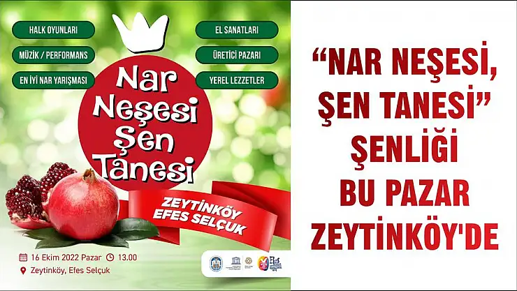 Efes Selçuk’un bereketli topraklarında yetişen lezzetli meyvelerden biri olan nar için düzenlenen şenlik 16 Ekim Pazar günü saat 13.00’te nar hasadının yapılmasıyla başlayacak. Şenlik kortejinin ardından halk oyunları gösterisi ve açılış konuşmaları ile devam eden şenlikte Zeytinköy’de yetişen en güzel seçileceği bir yarışma da düzenlenecek.