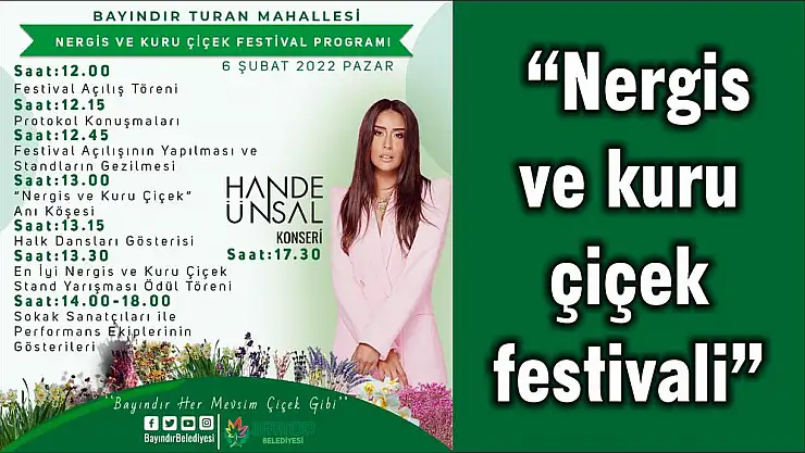 “Bayındır Her Mevsim Çiçek Gibi” sloganıyla, bu sene ilk kez düzenlenecek Bayındır Turan Mahallesi Nergis ve Kuru Çiçek Festivali Turan Mahallesi meydanında gerçekleşecek ve saat 12.00’de başlayacak. En iyi stant yarışması, halk oyunları gösterisi ve çeşitli etkinliklerin de yapılacağı festival saat 17.30’da sahne alacak Pop sanatçısı Hande Ünsal’ın konseri ile son bulacak.