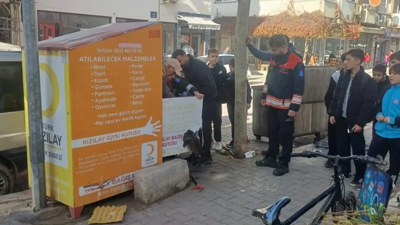 ÖDEMİŞ'TE KIZILAY BAĞIŞ KUTUSUNA SIKIŞAN KEDİ KURTARILDI
