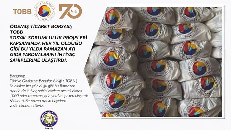 Ödemiş Ticaret Borsası Ramazan ayı nedeniyle 1000 adet gıda erzak paketi dağıttı. Türkiye Odalar ve Borsalar Birliği’nin destek verdiği yardımlar, Ödemiş Ticaret Borsası meclis üyeleri ve personel aracılığı ile ihtiyaç sahibi ailelere ulaştırıldı.