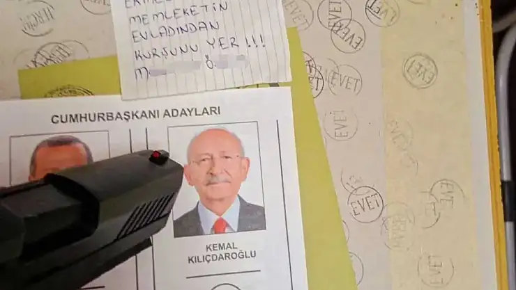 Rize’de bir vatandaş, oy kullanmak için gittiği okula silah getirdi. Yetmedi seçim kabinine de silahla girdi. Seçmen, silahını seçim pusulasındaki Kılıçdaroğlu fotoğrafına doğrultarak. “Bu ülkenin ekmeğini yiyip ihanet eden ekmeğini yediği memleketin evladından kurşun yer” yazılı bir kağıdı da pusulanın yanına bırakarak fotoğrafını çekti. Söz konusu fotoğrafı sosyal medya hesabından paylaşan seçmen M.Ö. hakkında şikayette bulunulması üzerine gözaltına alındı