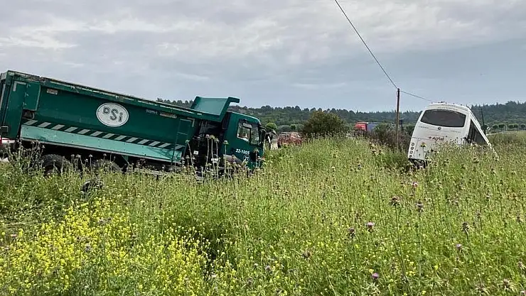 Saruhanlı Akhisar-Manisa karayolunda meydana gelen kaza, M.Ş. idaresindeki ticari araç karşı yönden gelen U.A. yönetimindeki 35 BFV 534 plakalı kamyonla çarpışarak gerçekleşti. Çarpışmanın etkisiyle savrulan kamyon yan şeritte seyir halindeki Y.A. idaresindeki 45 J 4330 plakalı işçi servisine çarptı. Çarpışma nedeniyle işçi servisi ve kamyon yoldan çıkarak tarlaya savruldu. Haber verilmesi üzerine bölgeye çok sayıda 112 Acil Servis ve jandarma ekipleri geldi. Jandarma ekipleri yolda güvenlik önlemleri alırken, kazada yaralanan 12 kişi ambulanslarla çevredeki hastanelere kaldırıldı. (İHA)