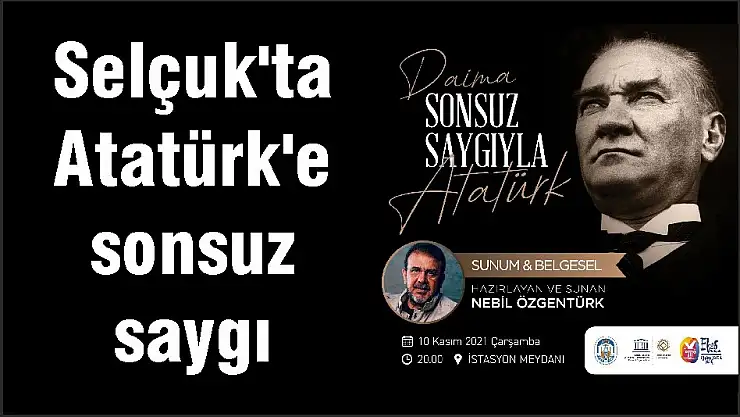 Ulu Önder Mustafa Kemal Atatürk, aramızdan ayrılışının 83. yılında Selçuk’ta Nebil Özgentürk’ün “Daima Sonsuz Saygıyla Atatürk” belgesel gösterimi ve sunum ile anılacak. Bu akşam saat 20.00’de İstasyon Meydanı’nda Nebil Özgentürk’ün hazırladığı “Daima Sonsuz Saygıyla Atatürk” konulu bir belgesel gösterimi ve sunum gerçekleştirilecek. Belgesel yapımcısı, gazeteci, yazar Nebil Özgentürk, Mustafa Kemal Atatürk’ü hiç bilinmeyen görüntüleri ve sözlerinin yer aldığı bir sunumla anlatacak.