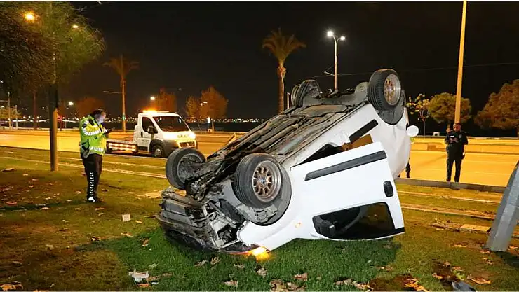 Konak Mustafa Kemal Sahil Bulvarı’ndan Konak istikametine giden 16 AKK 493 plakalı hafif ticari araç, önce tramvay hattına girdi, ardından aydınlatma direğine çarparak takla attı. Ters dönen aracın sürücüsü, kendi imkanlarıyla çıkarak olay yerinden uzaklaştı. İhbar üzerine bölgeye polis ekipleri sevk edildi. Araç, çekici yardımıyla kaldırılırken, polis ekipleri kaçan sürücüyü yakalamak için çalışma başlattı.