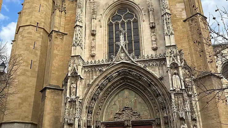 Fotoğrafta görülen görkemli cephe, Geç Gotik üslubun güçlü bir yansıması. Sivri kemerli ana giriş, İncil sahnelerini betimleyen heykellerle çevrili. Yüzyıllardır Aix halkını karşılayan bu kapılar, yalnızca bir mabede değil, tarihin içine açılıyor. Sol tarafta yükselen çan kulesi ise kentin siluetinde hâlâ belirleyici bir rol oynuyor.