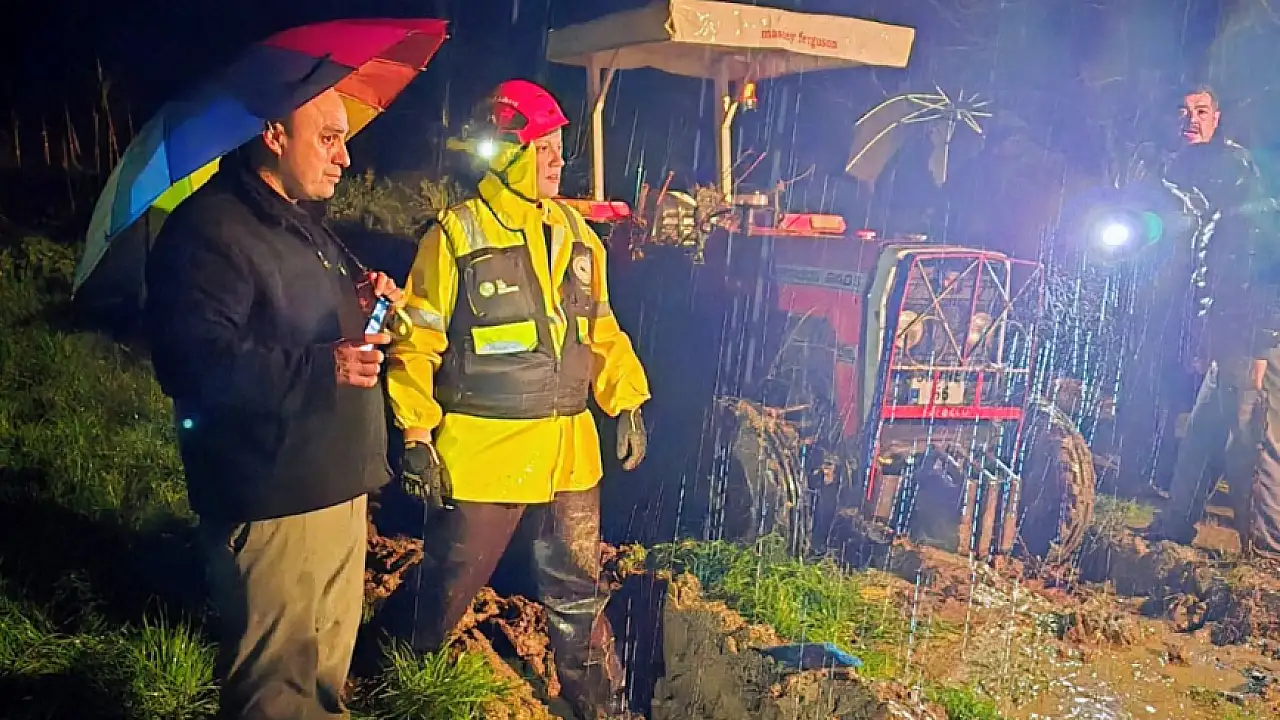 Tire'de dün gece etkili olan şiddetli sağanak yağış, günlük yaşamda aksamalara neden oldu. Sarılar Mahallesi'nde, yağışın ardından debisi yükselen dere yatağında bir traktörün mahsur kaldığı ihbarını alan Tire Belediyesi ekipleri, bölgede hızlı bir kurtarma operasyonu gerçekleştirdi.