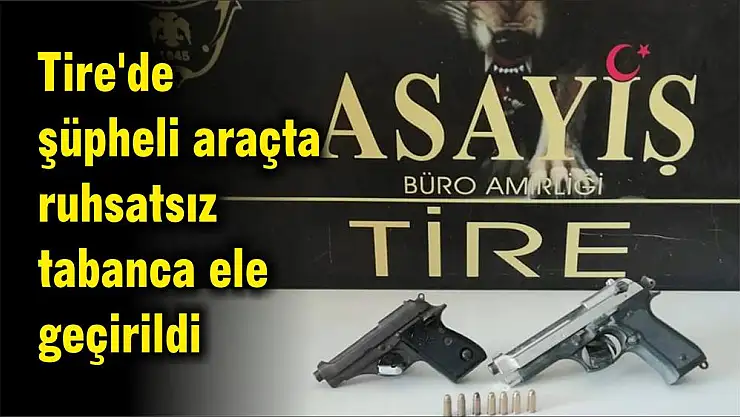 Tire İlçe Emniyet Müdürlüğü’ne bağlı ekipler ilçenin Samim Üzer Caddesi üzerinde şüphelendikleri bir aracı durdurarak yaptıkları aramada, araç içerisinden 1 adet ruhsatsız tabanca, tabancaya ait 7 adet 7.65 mm çapında fişek ve 1 adet kurusıkı tabanca ele geçirdi.