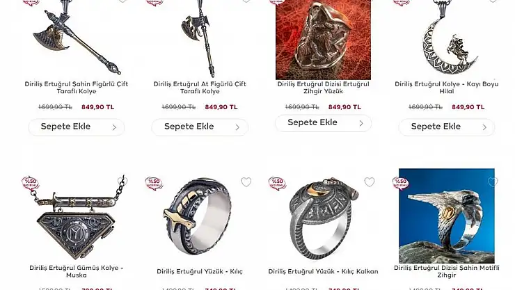 Ancak TRT Market’te yer alan ürünlerin fiyatları ve çeşitleri tartışmalara neden oluyor. Payitaht Mecidiye ve Osmaniye Nişanı ve Yüzük Seti indirimle 5 bin 499 TL’den satışa sunulurken asıl fiyatı 9 bin 999 TL. ‘Diriliş Ertuğrul Gümüş Kolye–Muska’nın yüzde 50 indirimli fiyatı ise 799.90 TL olarak belirlenmiş. Barbaroslar Zülfikar İşlemeli Tılsımlı yüzüğün fiyatı ise indirimle bin 920 TL’den satılıyor.