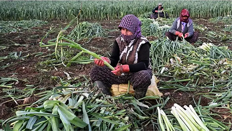 Hava sıcaklığının 5 derecelere düştüğü sabah saatlerinde tarlaya giren tarım işçileri, gün boyunca çalışıyor.