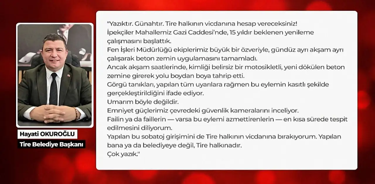 Başkan Okuroğlu, “Yapılan bu sobatoj girişimini de Tire halkının vicdanına bırakıyorum. Yapılan bana ya da belediyeye değil, Tire halkınadır.” Diyerek, siyasi sabotaj iddiasını gündeme getirdi.