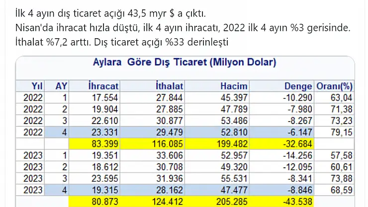 2023 yılı ilk 4 ayın ihracatı, geçen yılın ilk 4 ayına kıyasla %3 düşmüş durumda. Verilere göre “İthalat %7,2 arttı. Dış ticaret açığı %33 derinleşti.”
